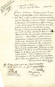 Rare réunion.La pièce est écrite par Christophe KOCH, et signée par KOCH, RITTER, RÜHL, BRUAT, RUDLER, LA PORTE, LAMBERT, MATHIEU, BRUNCK, HAUSSMANN. Pétition en faveur du hussard Wenger, natif de Guntershoffen. « Il s'est trouvé à la malheureuse affaire de Nancy, ou son cheval ayant été tué sous lui et le bras gauche lui ayant été emporté par un coup de canon, il a encore eu le courage de sauver la vie à M. de Coucy Lieutenant dans le ci-devant Régiment du Roi que ses propres soldats allaient massacrer »...