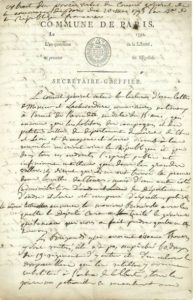 COMMUNE DE PARIS. P.A.S. par le secrétaire-greffier SÉGUY, extrait du procès-verbal du Conseil général de la Commune de Paris du 20 mai 1793 ; 3 pages in-fol. à en-tête Commune de Paris, petite vignette.