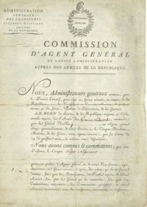 TRANSPORTS ET CONVOIS MILITAIRES. P.S. par 15 personnes, Paris 3 juin 1793 ; 3 pages in-fol. en partie impr. à en-tête Administration générale des transports et convois militaires pour le compte de la Républiques. Commission d'Agent général auprès des Armées de la République, vignette, 3 cachets de cire rouge (légère fente au pli).