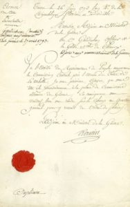Charles-Philippe RONSIN (1751-1794) auteur dramatique exalté par la Révolution, il devint commissaire des guerres puis général ; envoyé en Vendée, il vainquit La Rochejaquelein à Doué ; guillotiné avec les Hébertistes. L.S. comme « L'Adjoint au Ministre de la Guerre », Tours 26 juin 1793, au citoyen Gaudichon « officier de la Garde Nale de Chinon, adjoint aux commissaires des guerres » ; demi-page in-fol., cachet de cire rouge.