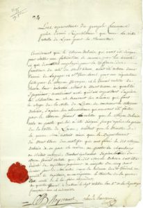 Claude JAVOGUES (1759-fusillé 1796) conventionnel (Rhône-et-Loire), il se montra terriblement sanguinaire dans sa mission dans le département de la Loire. P.S. cosignée par C.A.B. Reynaud(Haute-Loire), Q.G. à Oullins 7 octobre an II (1793) ; 1 page in-fol., cachet de cire rouge.