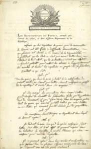 Réquisition des grains. Ils sont « informés que des réquisitions de grains pour la consommation de l'armée ont été faites à différentes administrations ; que plusieurs ont cherché à se couvrir de la responsabilité, en prétendant que les bleds ne sont pas encore battus dans l'étendue de leur ressort ; que la malveillance saisit avec avidité ce frivole prétexte pour mettre des entraves à l'approvisionnement des marchés et donner des inquiétudes au peuple sur sa subsistance »... Ils prennent un arrêté en sept articles : « Tous les grains, qui dans le mois, à dater de la notification du présent arrêté, ne seront pas battus, seront confisqués au profit de la république et versés dans ses magasins ».Des commissaires seront envoyés dans chaque canton,« pour faire verser dans les magasins publics tant les grains qui n'auront pas été battus, que ceux battus ou non battus qui n'auraient pas été déclarés par les propriétaires » ; ils sont autorisés à employer la loi du maximum, et à « requérir la force armée pour lee soutien de leurs opérations »…