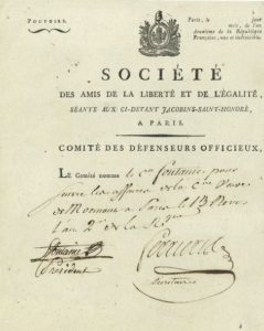 JACOBINS. Louis-François, comte de FERRIèRES-SAUVEBŒUF (1762-1814) aventurier, membre des Jacobins, il joua un rôle trouble d'indicateur et de délateur sous la Terreur. P.A.S. comme secrétaire, signée aussi par le président Fontaine, Paris 13 nivôse II (2 janvier 1794) ; 1 page in-4, en-tête Société des Amis de la Liberté et de l'Égalité, séante aux ci-devant Jacobins-Saint-Honoré, à Paris. Comité des défenseurs officieux.