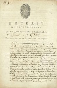 CONVENTION NATIONALE. P.S. par Jean Bassal, Philippe-Charles Goupilleaude Montaigu, et Simon Edme Monnel, Paris 5 pluviôse II (25 janvier 1794) ; 2 pages in-fol., vignette et en-tête Extrait du Procès-verbal de la Convention Nationale, sceau sous papier.