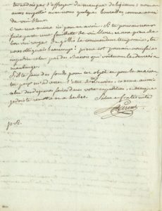 Curieuse lettre sur la façon expéditive de faire rentrer les contributions ordonnées par la loi du 27 brumaire... « ce jour est le jugement dernier de la republique. Tu vas donc faire avec Huber les fonctions nouvelles d'ange examinateur ; reveiller les morts et les endormis ; separer les citoyens des malveillans ; et lorsque la separation sera faite, il faudra en jetter quelques uns dans les tenebres, d'où ils passeront au tribunal revolutionnaire. Quelques exemples frappans accelereront les retards, et electriseront les administrations engourdies »... Puis il réclame « une feuillette de vin blanc, et une pièce de bon vin rouge », en avouant qu'il a emporté quelques bouteilles de liqueurs.