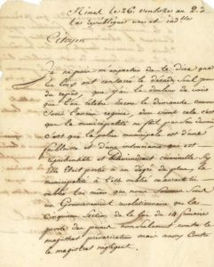 Protestation contre la célébration des dimanches par les Nîmois. Alors que « les loix ont consacré le décadi seul jour du repôs, […] j'ai la douleur de voir que l'on célèbre encore le dimanche comme sous l'ancien régime, […] la municipalité ne fait pas son devoir, […] la police municipale est d'une faibloisse et d'une insouciance qui est répréhensible et deviendrait criminelle sy elle était portée à un degré de plus ». Il rappelle que la loi doit être appliquée, qui punit « le magistrat prévaricateur » et négligent.... Il constate que « le fanatisme engage l'artisan à abandonner son atelier pour suivre le mauvais exemple que les muscadins et autres ennemis de notre révolution lui donnent de se parer et d'aller se pavaner comme l'on faisait jadis le jour qu'on appelait dimanche »…