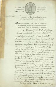 Marc-Antoine JULLIEN de Paris (1775-1848) homme politique et publiciste, ami de Robespierre, chargé d'importantes missions pendant la Terreur. L.A.S, Bordeaux 30 prairial II (18 juin 1794), à la municipalité de Lesparre ; 1 page et quart in-fol., vignette, en-tête Marc-Antoine Jullien, Membre de la Commission exécutive de l'Instruction publique, envoyé par le Comité de Salut public, à Bordeaux, adresse (trous de ver, bord intérieur rongé et réparé).