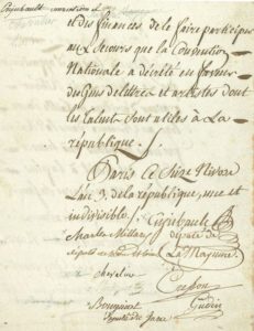 Aide à un artiste. Les députés certifient que « le citoyen Louis Ribière, graveur d'écriture en taille douce, logé au sixième dans la maison que nous habitons rue Honoré n°90, est réduit à la plus extrême misère avec sa famille par la cessation des travaux de son art ». Les signataires demandent aux membres des Comités d'Instruction publique et des finances « de le faire participer aux secours que la Convention Nationale a décrété en faveur des Gens de Lettres et artistes dont les talents sont utiles à la République »… Ont signé également Marc Bonguiot (Jura), Jacques Chevalier (Sarthe), Charles Millard (Saône-et-Loire), et 3 autres personnes.