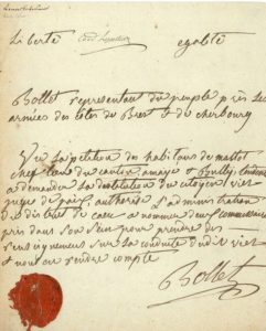 Albert BOLLET (1753-1810) conventionnel (Pas-de-Calais), il mit au point avec Hoche le traité de pacification de la Bretagne. L.A.S. et L.S. comme Représentant du Peuple près les Armées des Côtes de Brest et Cherbourg ; 1 page in-4 avec cachet de cire rouge et 1 page et demie in-fol. avec vignette et son en-tête.