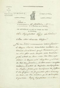 Jean-Baptiste AUBERT-DUBAYET (1757-1797) général de la Révolution, député à l'Assemblée législative, il fut ministre de la Guerre. L.S., Caen 22 fructidor III (8 septembre 1795), au Représentant du Peuple Henry LA RIVIÈRE ; 1 page et quart in-fol., petite vignette et en-tête Le Général en chef de l'Armée des Côtes de Cherbourg.