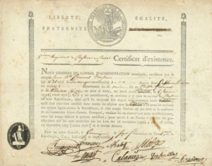 Certificat d'existence, délivré par les Membres du Conseil d'administration du 5ème Régiment des Chasseurs à Cheval, certifiant que le citoyen Sarnaut, Chasseur, « s'est très bien conduit dans toutes les affaires que le Régiment a eu avec les esclaves des tyrans ligués contre la République »…Rare.
