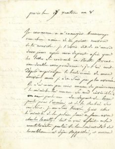 Intéressante lettre sur les nouvelles du jour et sur Bonaparte. Depuis son arrivée à Paris il n'a pu voir « aucune des puissances, le ministre lui mesme se rend invisible. On ne parle que du depart de Bonaparte pour l'armée, et de la rentrée des emigrés. Je me suis trouvé hier ches le ministre de la police face a face avec Charles Lameth. Tout ce qui a fait à la Constituante partie de la minorité de la noblesse est déjà rappellé, et mesme avant que l'arreté du consul fut connu ces Mrs etoient au milieu de nous. Je souhaite qu'on s'en trouve bien, mais on les considere beaucoup »… Ses démarches en faveur d'un abbé ont réussi, mais il recommande désormais la discrétion : « dans ce labirinthe mistique de dogmes et de vertus exclusives, il n'y a presque pas une route qui soit praticable et le mieux est de ne pas s'y engager »… Il termine par une anecdote sur SIEYÈS et Bonaparte : « Scies disoit il y a quelque temps a Bonaparte qu'il trouvoit inconvenant qu'il allat occuper le logement de Louis 16. Qu'il pouvooit se rappeller du 10 aoust. Si j'avois eté Louis 16, dit Bonaparte, je serois encore Louis 16, et si j'avois eté prestre, je le serois encore. »