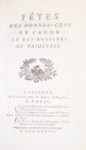 LE MONNIER (l'abbé Guillaume-Antoine). Fêtes des bonnes-gens de Canon et des Rosières de Briquebec. Avignon, Et se vend au profit des Rosières de Briquebec ; Paris, l'abbé Le Monnier, Prault, Jombert&Cellot, Veuve Vallat-la-Chapelle, 1777. In-8, veau marbré, dos lisse orné, roulette intérieure, tranches rouges (Reliure de l'époque).