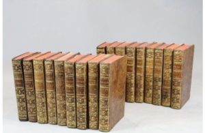 Des rousseurs. Mouillures à certains tomes, surtout au tome I de 1787 et au tome II de 1789 qui sont très mouillés avec traces de moisissures (les planches du tome de 1787 sont détachées et fortement abimées). Mention de titre et de tomaison effacée au dos d'un volume.