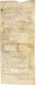 ALAMANNI, Chantilly 29 juillet1566 ; vélin in-fol. (16x38 cm; mouillure). Rare compte de bouche de la maison du duc d'Anjou pour la journée du 29 juillet 1566 à Chantilly. Les différentes dépenses de nourriture :panneterie, échansonnerie, cuisine, fruicterie, et fourrière, sont ici notées dans ce compte : « Aux moynes de Reaulmont[Royaumont] pour ii septiers vin de bouche lx sols »… Les gages de divers membres de la maison du jeune Prince sont aussi recensés et gagés : le maître d'hôtel Strossy, le maître d'hôtel Alamanni, le trésorier, le contrôleur, le clerc d'office, le « précepteur de Monseigneur », le médecin Millet, l'apothicaire, l'écrivain, le chapelain et le clerc de chapelle, le lavandier de corps, etc… [Niccolo Alamanni, fils de Luigi (1495-1556, poète florentin exilé en France et protégé de François),né vers 1520, suivit la carrière des armes au service de la France. En 1553, il est de la campagne de Sienne ; en 1555, il reçoit le commandement de deux galères envoyées au secours de Gênes. Protégé de Catherine de Médicis, il devient maître du palais royal.]