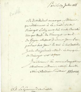 Bastille. - « D'après l'observation [...] que plusieurs de MM les Gentilshommes Bretons détenus à la Bastille ne soupent point, et qu'il seroit plus agréable pour tous de diner ensemble que d'y souper je prendrai sur moi de changer les ordres qui ont été donnés et je vous prie en conséquence de vouloir bien les faire diner ensemble au nombre de trois »... - Le Roi consent, relativement à la santé de M. Trémergat, à ce que Mme de Trémergat et Mme de Goyon aillent le voir à la Bastille. Ancienne collection Alain Taillade (28 mars 1985, n° 61, son cachet encre).
