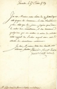 Cagliari en Sardaigne ; demi-page in-fol. Depuis sa lettre de juillet, « les évenemens se sont succédés plus vite que les jours ; j'espère que, dans le cahos des circonstances, il s'en trouvera quelqu'une qui me mettra à même de solliciter votre rappel du Rocher auquel vous ont attaché les circonstances antérieures »…