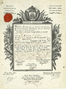 nationale de Paris, signée aussi par Charles-Joseph Viguier-Curny, commissaire général de la Garde nationale, et avec griffe du Maire de Paris Petion, Paris 30 juin 1792 ; 1 page in-fol. en partie impr., en-tête et sceau de cire rouge Garde Nationale Parisienne, vignette aux armes de Paris et encadrement gravé aux emblèmes de la Garde Nationale. Congé absolu pour Jean CHAPUIS, adjudant de la 4e compagnie du corps dans lequel il a servi 25 ans, 2 mois et 14 jours « avec honneur et fidélité », et en outre, « trois ans un mois et cinq jours dans Dauphin Dragons dans lequel il a fait deux campagnes » ; il doit aux termes de la loi du 9 octobre 1791, « jouir en outre de son service pour la recompense militaire de deux ans et quatre mois de service pour la revolution »…