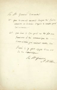 accusation de connivence avec l'ennemi(pour avoirécrit au Landgrave de Hesse ; il sera suspendu de ses fonctions). « Le Lt General demande 1° que leconseil executif daigne lui faire connoitre sa decision d'apres le compte qu'il lui a rendu 2° que dansle, cas quil ne lui fut pas favorable il lui communique les denonciations qui existent contre lui »... On joint une P.S. « Danton » (griffe), 11 octobre 1792 (demi-page in-fol., en-tête Décret de la Convention Nationale) : « le Conseil Exécutif provisoire rendra compte [...] des renseignemens qui lui ont été adressésrelativement à la conduite du Général Dillon envers le Landgrave de Hesse-Cassel ».