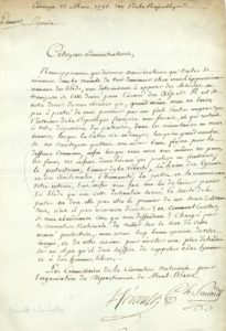 (1755-1794), Carouge 22 mars 1793, aux « Citoyens administrateurs » ; 1 page in-fol. Commissaires de la Convention Nationale pour l'organisation du Département du Mont-Blanc, ils rappellent aux administrateurs qui font obstacle au blé destiné à l'armée des Alpes, que leur devoir est d'en assurer le transport, et que l'armée est prioritaire. Il est primordial que cette denrée atteigne sa destination… « Lorsque la patrie est en danger, lorsqu'un grand nombre de nos concitoyens quittent avec ardeur leur foyer pour la deffense commune, enfin lorsque vous avez-vous-mêmes vos pères, vos frères, vos enfans dans l'armée qui protège vos frontières, le patriotisme, l'amour de la Liberté, la haine des Tyrans et des Aristocrates, l'humanité, la justice et la reconnoissance, votre intérêt, tout enfin vous fait une loi de laisser passer les bleds qui ont cette destination sacrée. La sûreté de la Patrie ne doit-elle pas être le premier de nos soins ? Avant tout, n'est-il pas nécessaire d'exister ? et comment exister, si vous abandonnez ceux qui nous défendent »…