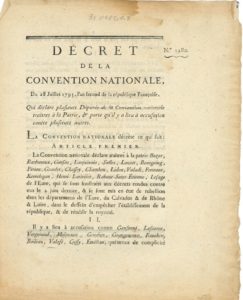 nationale : 31 mai, Qui supprime la Commission de Douze ; fixe au 10 août prochain, une Fédération générale & républicains, & détermine les mesures à prendre pour la sûreté des personnes & des propriétés, & le maintien de la tranquillité publique ; 2 juin, Qui met en arrestation différens Membres de la Convention nationale (2 ex. dont un relié) ; 28 juillet, Qui déclare plusieurs Députés de la Convention nationale traîtres à la Patrie, & porte qu'il y a lieu à accusation contre plusieurs autres ; 3 octobre, Qui traduit plusieurs de ses Membres devant le Tribunal révolutionnaire, & en met d'autres en état d'arrestation. Compte rendu à nos commettans, 7 juin (in-8 de 7 p., très rare), par les députés arrêtés et retenus prisonniers lors de la révolution du 31 mai. 27 frimaire III (17 décembre 1794), décret signé par J. Becker, Boucher-Sauveur et Daunou, pour l'arrêt des poursuites par les tribunaux contre les députés nommés dans les décrets des 28 juillet et 3 octobre 1793 ; 18 ventôse III (8 mars 1795), décret signé par Bailly, Enjubault et Marragon, rappelant les députés proscrits ; 19 ventôse III (9 mars 1795), décret signé par les mêmes, ordonnant l'examen par le Comité de Sûreté générale de « la conduite des chefs et auteurs de l'insurrection du trente-et-un mai »…