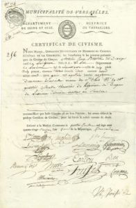 1793 ; 1 page in-fol.,vignette et en-tête de la Municipalité de Versailles, cachet fiscal, et cachet de cire rouge. Certificat de civisme pour le citoyen Antoine Jean Brestin dit Duverger, « quartier Maître trésorier du Régiment de Dragon de Lorraine désirant entrer au Service ». Il est visé par les administrateurs du District (6 signatures) et par les membres du Directoire du dép. de Seine et Oise (6 signatures). Très rare.