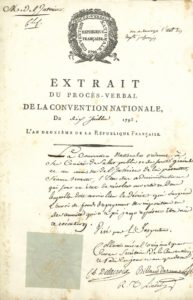 vignette et en-tête de la Convention Nationale, sceau sous papier. Extrait du Procès-verbal de la Convention Nationale qui ordonne que lui soit présenté « séance tenante l'état des administrations qui sont en état de révolte ouverte et dans lesquelles doit avoir lieu le décret qui suspend l'envoi de fonds du payement des impositions et des annuités qui n'a pas pu jusqu'à présent mis à exécution ».