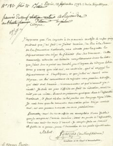 Panis ; 1 page in-4. « François (de Neufchâteau) malade et en état d'arrestation », réfute l'accusation qui lui est faire d'avoir refusé de « lire à la Barre de la Convention nationale une adresse par laquelle le Département des Vôges la félicitait sur ses travaux. Cette accusation absurde est détruite complètement dans la lettre que j'écris sur ce point au Comité ». Car c'est bien lui au contraire qui a « engagé le Département à s'expliquer, et que je lui ai sauvé une disgrasse, en lui conseillant de refondre une première adresse, qui était mal tournée, inconvenante et qui n'aurait pas réussi. Je suis un peu difficile en terme de rédaction, mais ce n'est pas un crime. Quand on présente quelque chose à l'Assemblée Nationale, il faut tâcher de lui parler un langage digne d'Elle. Je crois donc que la nouvelle accusation qu'on dirige contre moi, est une preuve nouvelle de mon patriotisme ». Il joint à cette lettre un exemplaire d'une fable qu'il a composé en août dernier lors d'une nuit de garde à l'Assemblée : « Je compte faaire un recueil de fables de ce genre, pour l'instruction de nos petits républicains »…