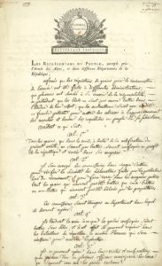 in-fol., vignette et en-tête Les Représentans du Peuple envoyés près l'Armée des Alpes, et dans différens Départemens de la République. Réquisition des grains. Ils sont « informés que des réquisitions de grains pour la consommation de l'armée ont été faites à différentes administrations ; que plusieurs ont cherché à se couvrir de la responsabilité, en prétendant que les bleds ne sont pas encore battus dans l'étendue de leur ressort ; que la malveillance saisit avec avidité ce frivole prétexte pour mettre des entraves à l'approvisionnement des marchés et donner des inquiétudes au peuple sur sa subsistance »... Ils prennent un arrêté en sept articles : « Tous les grains, qui dans le mois, à dater de la notification du présent arrêté, ne seront pas battus, seront confisqués au profit de la république et versés dans ses magasins ».Des commissaires seront envoyés dans chaque canton,« pour faire verser dans les magasins publics tant les grains qui n'auront pas été battus, que ceux battus ou non battus qui n'auraient pas été déclarés par les propriétaires » ; ils sont autorisés à employer la loi du maximum, et à « requérir la force armée pour lee soutien de leurs opérations »…
