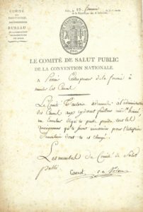 23 frimaire II et 18 ventôse II (13 décembre 1793 et 8 mars 1794) ; 1 page in-fol. chaque à vignette et en-tête du Comité de Salut public, adresse à la 2e. 23 frimaire, à Perrier, entrepreneur de la forerie à émouler les canons : « Le Comité t'autorise à demander à l'administration des canons aux cydevant Feuillants […] un émouleur de qui tu puisses prendre tous les renseignemens qui te seront nécessaires pour l'entreprise d'émoulerie dont tu es chargé »… - 18 ventôse, aux agents nationaux des Poudres et salpêtres, concernant Souret et sa conduite ; « l'intention du Comité est que les préposés de l'agence soient nommés suivant le mode qui a été suivi jusqu'à présent »… On joint une L.S. comme membre du Directoire exécutif, 10 pluviôse V (29 janvier 1797), à la citoyenne Dessaubaz, concernant la mise à la retraite de son mari, suite à son âge et à sa surdité (1 p. in-4)..