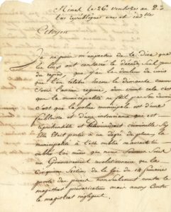 j'ai la douleur de voir que l'on célèbre encore le dimanche comme sous l'ancien régime, […] la municipalité ne fait pas son devoir, […] la police municipale est d'une faibloisse et d'une insouciance qui est répréhensible et deviendrait criminelle sy elle était portée à un degré de plus ». Il rappelle que la loi doit être appliquée, qui punit « le magistrat prévaricateur » et négligent.... Il constate que « le fanatisme engage l'artisan à abandonner son atelier pour suivre le mauvais exemple que les muscadins et autres ennemis de notre révolution lui donnent de se parer et d'aller se pavaner comme l'on faisait jadis le jour qu'on appelait dimanche »…