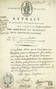 COMITÉ DES FINANCES. 2 P.S. et 1 L.S., septembre-novembre 1794 ; 3 pages in-fol. et 2 p. in-4, vignettes et en-têtes. 22 fructidor II (8 septembre 1794), à en-tête et cachet encre du Comité des Assignats et Monnoies. Mise à disposition d'une...