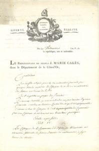 Jean-Marie CALÈS (1757-1834) conventionnel (Haute-Garonne). P.S. comme Représentant du Peuple dans le Département de la Côte d'Or, 29 vendémiaire III (20 octobre 1794) ; 2 pages in-fol. à son en-tête et vignette, cachet de cire rouge. Curieux...