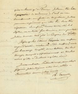 J'ai connu, j'ai senti vos malheurs. J'étais informé que la Feuille villageoise était le grand grief du monstre contre vous. [...] Vous aviés eu, comme moi, le courage, et plus que moi, le talent de dire la vérité. D'ailleurs, le Tyran en savait sur moi plus que je ne pouvais lui en apprendre, et l'on m'assure que ses listes en portent la preuve. [...] avec quelle joie j'ai appris la digne réparation que vous a faite la justice nationale ; j'en ai été ému jusqu'aux larmes ». Grouvelle envoie à Ginguené, à Garat et à Siéyès un écrit fait « à l'usage des étrangers bienveillans et mal instruits », traduit en allemand, en danois et en suédois : « cette apologie du régime révolutionnaire ne s'applique point aux quatre ou cinq derniers mois de la domination néronienne des oligarques du 9 Thermidor ». Il se plaint de son éloignement et se compare à Ovide...