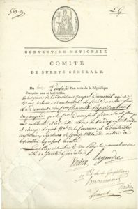 COMITÉ DE SÛRETÉ GÉNÉRALE. 4 P.S. par plusieurs membres, janvier-octobre 1795 ; 1 page in-4 à en-tête, et 3 pages in-fol. avec vignette et en-tête du Comité de Sûreté générale. 24 nivôse III (13 janvier), par J.B. Clauzel et S. Laporte,...