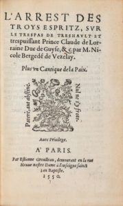 BERGEDÉ (Nicole). Ɵ L'Arrest des troys espritz, sur le trespas de treshault et trespuissant …