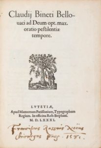 Édition originale de cette oraison latine contre la peste, composée par Claude Binet, poète et premier biographe de Ronsard.