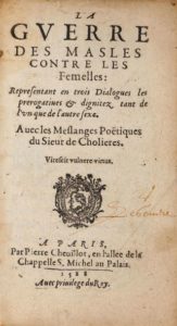 CHOLIÈRES (Jean Dagonneau, sieur de). Ɵ La Guerre des Masles contre les Femelles : Représentant en trois Dialogues les prérogatives & dignitez tant de l'un que de l'autre sexe. Avec les Meslanges Poëtiques. Paris, Pierre Chevillot, 1588. In-12, veau porphyre, roulette dorée en encadrement, dos lisse orné, pièce de titre rouge, tranches jaspées (Reliure de la fin du XVIIIe siècle).