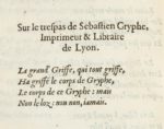 Cette petite plaquette comprend l'ode de L'Antiquité et excellence de la ville de Lyon, un poème de quatre vers Sur le trespas de Sébastien Gryphe, fameux imprimeur et librairie de la ville, et diverses épigrammes adressées à différents personnages : l'une d'elles a été composée pour le bibliophile Jean Grolier dont l'auteur ni sa muse ne veulent taire la renommée (p. 26).