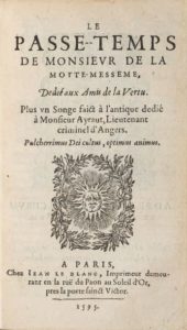 LA MOTTE-MESSEMÉ (François Le Poulchre de). Ɵ Le Passe-temps, dédié aux Amis de la Vertu. Plus un Songe faict à l'antique. Paris, Jean Le Blanc, 1595. In-8, maroquin bordeaux, janséniste, dentelle intérieure, tranches dorées sur marbrure (Chambolle-Duru).
