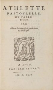 Belle réédition lyonnaise de cette pastorale dramatique signée de l'anagramme de l'auteur, dont l'édition originale parut à Paris en 1585. Comme l'indique Baudrier, cette édition semble être celle de 1591 donnée par le même Jean Veyrat, mais avec un titre de relais.