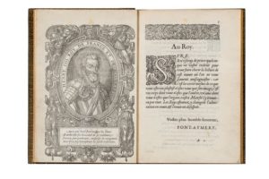 Superbe portrait gravé sur bois du roi Henri IV, en médaillon dans un encadrement Renaissance, imprimé au verso du titre.