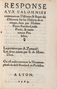 En publiant en 1562 son fameux Discours des misères de ce temps et sa Continuation... (voir n° 118), Ronsard avait suscité une vive réaction dans le camp réformé. Les protestants voulurent se venger ; leur courroux se déversa alors contre le Vendômois en la plume de deux poètes et ministres réformés, Bernard de Montméja (vers 1535-1574) et Antoine de La Roche-Chandieu (1534-1591), dissimulés sous deux pseudonymes à la consonance prophétique : B. de Mont-Dieu et A. Zamariel.