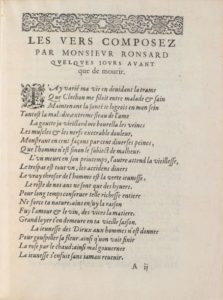 En tête de cette laudatio, ont été imprimés les Vers composez par Monsieur Ronsard quelques iours avant que de mourir et le Tombeau de l'Autheur composé par luy-mesme (ff. A2-4).