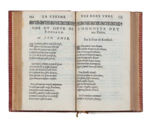 Le compilateur a également inséré 10 pièces de Ronsard, et non unze comme il est indiqué à la table. Un commentaire de l'éditeur, imprimé p. 201, nous explique : I'ay voulu mesler ces pieces du Sieur de Ronsard, pour faire voir la difference du stile du passé au present. Comme le souligne J. P. Barbier-Mueller, il est intéressant de voir que quelques années avant que ne paraisse la dernière édition collective des Œuvres complètes de Ronsard (1630), on considérait déjà ses vers comme assez archaïques pour être comparés, comme curiosités, avec les productions des contemporains de Malherbe.