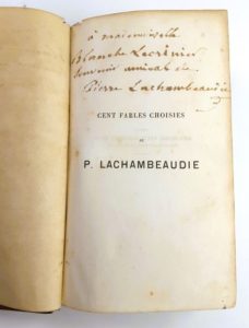 FABLES / 1°) « Dictionnaire de la Fable », Le Normant, An XII (1803), 2 tomes reliés d’époque (qq défauts), étiquettes de remise de prix du Lycée de Saint-Omer - 2°) « Cent Fables choisies » par Pierre Lachambaudie, Pagnerre, 1864, relié plein bradel rouge, avec envoi autographe signé de Lachambaudie