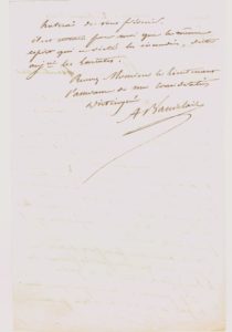 [Charles BAUDELAIRE] - Claude-Alphonse BAUDELAIRE (1805-1862, Demi-frère du poète Charles Baudelaire, Tous deux étaient fils de Joseph-François Baudelaire, Claude-Alphonse était Juge d'Instruction au Tribunal de Fontainebleau) / 1°) Intéressant document : BROUILLON avec ratures et corrections d'une lettre de dénonciation envers Claude-Alphonse Baudelaire, 2 p grand in-4, écrite de la main du Préfet de Seine-et-Marne Louis-Charles-Marie de Vincent (1792-1872) au Ministre de la Justice, de Fontainebleau le 26 mai 1851 – [L'historien Claude Pichois spécialiste de Baudelaire relate en effet que le 25 mai 1851 le Sous-Préfet de Fontainebleau écrivit au Préfet de Seine-et-Marne pour se plaindre de Claude-Alphonse - Dès le 26, le Préfet se dépêcha d'écrire au Ministre - Pichois précise que le 11 novembre suivant, Claude-Alphonse était déclassé simple juge - Pichois détermina qu'en 1857, Le Général Aupick (beau-père de Charles de son côté maternel) fit une intervention auprès du Ministre pour réhabiliter Claude-Alphonse qu'il dit avoir été victime d'intrigues - La mort du Général Aupick cette même année ne permit aucune amélioration dans la carrière de Claude-Alphonse qui végéta à un petit poste juridique jusqu'à sa retraite - Cette lettre de dénonciation fut donc fatale dans la vie de Claude-Alphonse - Le fait d'être le demi-frère de Charles Baudelaire fut-il au centre de ces intrigues ?] : "J'ai l'honneur d'appeler votre attention sur la conduite de Mr Baudelaire, juge d'instruction au tribunal de Fontainebleau. Ce magistrat dont les idées me paraissent pas toujours parfaitement justes, oublie sans cesse la dignité et les convenances inhérentes à sa position. Il fait plus, il a avec les prisonniers des relations toutes contraires à celles qu'il devrait avoir, et va même jusqu'à leur procurer dans la prison, des objets défendus par le règlement. C'est ainsi qu'il a fourni à un nommé Grangé, de Bar-le-Duc, enfermé à la prison célulaire de Fontainebleau, et poursuivi pour délit politique, un compas, un tireligne, une équerre et différents autres objets. Il est allé plus loin : il a dit à Grangé : "Vous ne devriez pas continuer de vous conduire ainsi, cela vous fera du tort, quoique je ne vous crois pas coupable, car si j'étais votre juge je vous acquitterais". Si ce ne sont pas là ses propres paroles, c'est au moins leur sens. Tous ces détails m'ont été donnés hier par Monsieur le Sous-Préfet de Fontainebleau. J'ai cru devoir, pour être plus certain de leur exactitude en parler au Procureur de la République, qui est venu me les confirmer. Je pense Monsieur le Ministre, que Mr Baudelaire, qui a perdu la plus grande partie de sa fortune, qui subit une retenue consensuelle sur ses appointements, ne peut plus continuer plus long temps à exercer les fonctions de juge d'instruction près d'un tribunal où sa considération et son influence sont nulles. Peut-être pourriez-vous, Monsieur le Ministre, obtenir par votre influence sur Mr Baudelaire, qu'il consentît à accepter une situation telle que les graves inconvénients que je vous signale ne puissent plus se reproduire" – 2°) Lettre écrite et signée de Claude-Alphonse BAUDELAIRE, 2 p in-8, en-tête "Tribunal de Fontainebleau - Cabinet du Juge d'Instruction", Fontainebleau, 23 janvier 1849