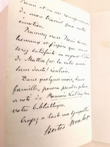 Hector MALOT (1830-1907, romancier) / « Sans Famille », J. Hetzel et Cie, Paris, sans date [1880], 566 p in-4, dessins d’Emile Bayard, relié demi-basane bleu (dos passé et frottements), exemplaire enrichi d’une LAS d’Hector Malot, de Fontenay-sous-Bois, du 14 avril 1878, à une jeune lectrice, enveloppe conservée : « Quand ma petite fille écrit une lettre, elle tient beaucoup à ce qu’on lui réponde, je pense qu’il en est de même pour vous. Je ne veux donc pas que vous ayez la déception d’attendre en vain une réponse à votre lettre si gentille et gracieuse. Ce serait d’autant plus mal à moi de vous causer une peine si légère qu’elle fut, que vous m’avez fait grand plaisir en vous intéressant à mon petit Rémi et en me récompensant de mon travail par votre émotion. Rassurez-vous, Rémi sera heureux et j’espère que vous serez satisfaite en voyant l’idée de Mattia (et la votre aussi sans doute) réalisée. Dans quelques mois, « Sans Famille » pourra prendre place à côté de « Romain Kalbris » dans votre bibliothèque »
