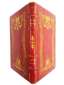 Anatole FRANCE « Madame de Luzy » avec 10 compositions dessinées et gravées par Ad. Lalauze, Ed. Ferraud, Paris, 1902, belle reliure signée de René Kieffer, plein maroquin rouge (qq frottements), plats dorés au fer de motifs XVIII°, intérieur doublé de peau brune avec motifs dorés aux angles, couverture conservée, 1 des 60 exemplaires numérotés sur grand papier vélin d’arches, avec les eaux-fortes en triple état, dont l’eau-forte pure, exemplaire enrichi d’un portrait original d’époque au crayon d’Anatole France (anonyme)