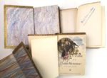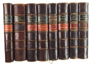 BIBLIOPHILIE – Henry KISTEMAECKERS (1872-1938, romancier et auteur dramatique belge) / Unique ensemble de 8 romans en éditions originales, tous sur papier hollande, en très petit tirage (2/5, 2/6 ou 2/10 et 3/10) présentés dans un même style de reliure par J. Foulquier (plein maroquin chocolat, dos à 5 nerfs, double pièce de titre, date en queue, filets d’encadrement dorés à la roulette sur l’intérieur des plats, tranche supérieure dorée, une seule reliure est signée) : « Les Amants romanesques » (1891, Ernest Flammarion, non justifié car pas de grand-papier officiel, mais sur papier hollande) – « Chères Pêcheresses » (1893, non justifié car pas de grand-papier officiel, mais sur papier hollande) - « La Dame et le Demi-Monsieur » (1901, Ernest Flammarion, illustré par Foäche, justifié mais non numéroté), « Le Marchand de Bonheur » (1903, Bibliothèque Charpentier, 2/10), – « La Rivale » (1907, Charpentier-Fasquelle, 1/5), « Les Mystérieuses » (1907, Bibliothèque Charpentier, 2/6) - « Monsieur Dupont Chauffeur » (1908, Bibliothèque Charpentier, 2/10) – « La Flambée » (1912, Charpentier-Fasquelle, 3/10) / Etat : intérieurs frais sauf 1 avec quelques rousseurs, manque 1 pièce de titre à un dos, quelques frottements